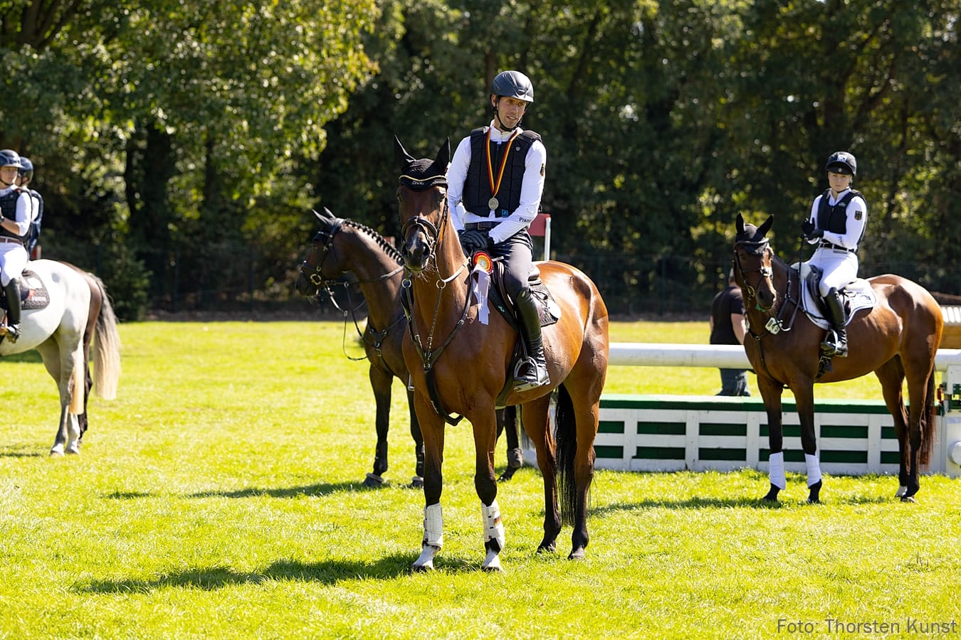 Im Gelände holte Barcley v. Buster Moon/Cascadello I (Z.: Gerd Neukäter) unter Anna Lena Schaaf nach drei überragenden Runden in den Teilprüfungen Dressur, Springen und Gelände den Sieg. Dicht gefolgt wurde das Paar von Jerome Robine und Die Elli (VA Fohlenauktion 2020) v. Diacontinus/Escudo unter aus der Zucht von ZG Matthias und Annette Bug, Petersberg, die die silberne Schleife stolz entgegennahmen. In der Altersklasse der sechsjährigen Vielseitigkeitspferde konnte Dacora De Rioja FRH v. Diacontinus/Con Sherry