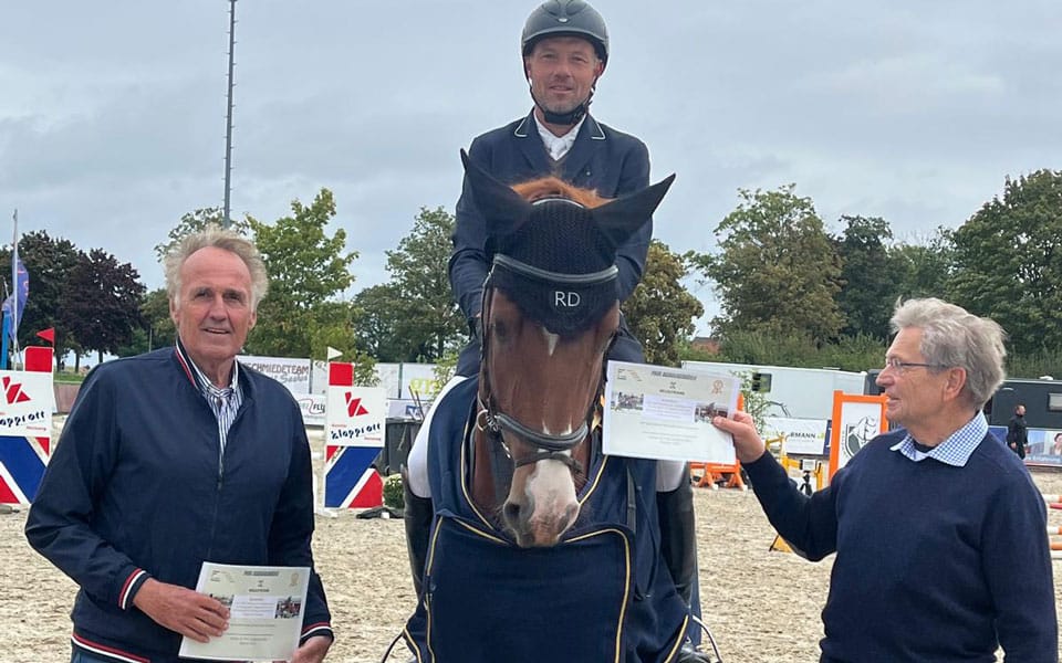 Schon die Einlaufprüfung bei den vierjährigen Pferden ließ auf ein spannendes Finale hoffen, was sich dann mit hochinteressanten Pferden in der Entscheidung bestätigte. Und wenn auch der ein oder andere Nachwuchsspringer durch den auffrischenden Wind an diesem ersten Frühherbsttag etwas irritiert war, hatte das Starterfeld doch eine klare Siegerin. Disney PJ, die Don VHP Z-Tochter aus Emmy Jo v. Escudo I brillierte bei ihrem Auftritt unter dem Sattel von Roman Duchac und konnte souverän ein weiteres Mal für die Zuchtstätte Dr. Jacobs GbR in Bierbergen einen Sieg im Bezirkschampionat erringen.