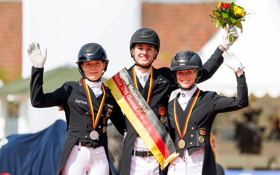 Bei den Deutschen Meisterschaften sind die ersten Titel vergeben worden. Im Viereck wurden Cadeau Noir v. Christ/De Niro (Z.: Thomas Heuer, Bienenbüttel) und Moritz Treffinger Deutsche Meister der U25-Reiter. Das Gestüt Bonhomme hatte den Rappen 2012 auf dem Hengstmarkt entdeckt. Damals noch nicht gekört, wurde er zwei Jahre später zur Zucht zugelassen. Mittlerweile hat der Privatbeschäler internationale Erfolge auf höchstem Niveau gesammelt und war im Vorjahr mit der Bronze-Medaille aus Balve zurückgekehrt.