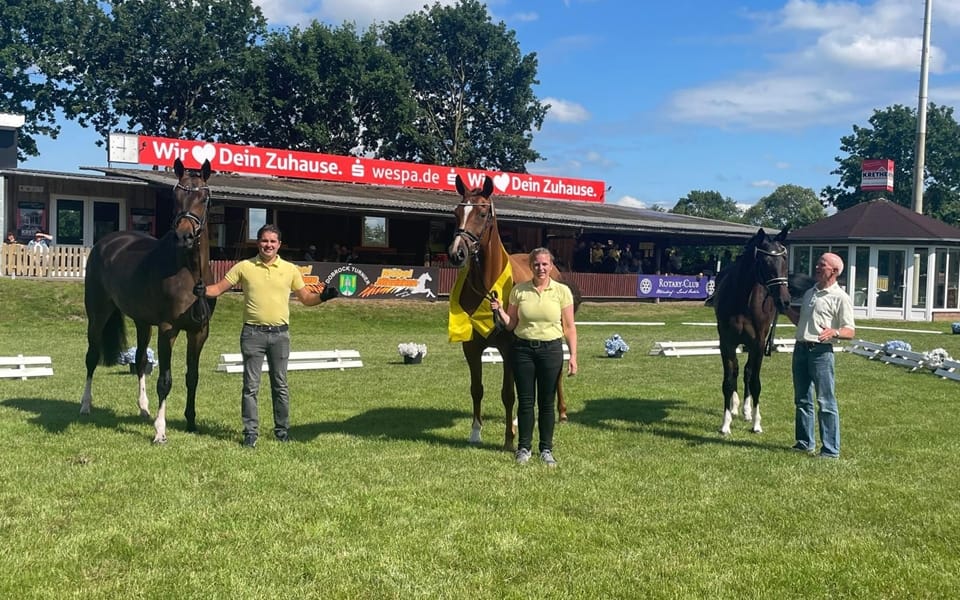 Anschließend starteten die Zweijährigen auf dem Dreieck. Hier lag die Prämierung bei 100 Prozent, was die hervorragende Entwicklung dieser jungen Pferde unterstrich. Besonders auffällig war, dass alle zweijährigen Stuten bereits gut eingemustert waren und eine schöne Entwicklung zeigten, ohne dabei zu weit zu sein. Es wurde jedoch deutlich, dass in Zukunft noch mehr Augenmerk auf das Fundament gelegt werden sollte, da einige Stuten eine lange Fesselung aufwiesen. Beste Stute der Zweijährigen wurde eine Despacito-Tochter aus einer Stute v. Quasar de Charry aus der Zucht von Bernd Meyer aus Neuenfelde und dem Besitz von Rene Janzen aus Wischhafen.