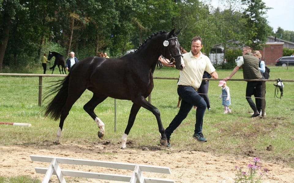 In den traditionellen Zuchtregionen entlang der Küste werden noch häufiger zweijährige Stuten vorgestellt als andernorts. So auch in Großenwörden. Alle der im Katalog verzeichneten sieben Stuten wurden vorgestellt, sechs von ihnen konnten mit einem Ia-Preis ausgezeichnet werden. An der Spitze stand eine im Typ deutlich vom Muttervater geprägte Rappstute von Von Und Zu/Dancier (Züchter Jörg Rademacher, Geestland, Besitzer Ferdinand Meyer, Arzfeld). Die bergauf konstruierte Stute ist bereits sehr weit entwickelt und bewegte sich entsprechend kraftvoll im Trab. Im Schritt überzeugte sie mit guter Taktsicherheit und passendem Raumgriff. Ihr Halbbruder Fundancer v. Finnigan wurde 2021 in Verden gekört. Hervorzuheben ist auch die an zweiter Stelle rangierte Stute dieser Abteilung. Als einzige Springstute dieser Gruppe konnte sich die markante Fuchsstute v. Camp Nou/Comte (Züchter Ingo König, Großenwörden, Besitzer Stefan Wolter, Engelschoff) mehr als gut behaupten. Wie sehr sie ihrer Mutter gleicht, wurde zum Abschluss der Schau deutlich, als sie als Teil der Familie „Mutter mit zwei Töchtern“ der St.Pr.St. Constanze v. Comte/Graf Sponeck (Züchter Ingo König, Großenwörden) vorgestellt wurde. Diese Familie, der Graf Sponeck seine Bewegungsdynamik weitergegeben hat, wurde mit dem Elitetitel ausgezeichnet.