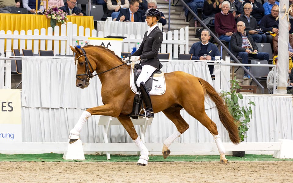 Auf Platz zwei im Ranking trabte Bundeschampionesse Hann.Pr.A. Blue FRH v. Buckingham/Locksley II (Z.: Andrea Bentes, Wittingen), die 1.120 Euro verdiente. 2022 war sie mit Züchtertochter Maren Müller bereits in Warendorf am Start gewesen. 2023 stieg die renommierte Ausbilderin Tessa Frank in den Sattel der dynamischen Braunen und machte sie beim Bundeschampionat zu Deutschlands bestem sechsjährigen Dressurpferd. Angefangen hat alles bei Familie Bentes mit Blues Großmutter St.Pr.St. Wega v. Western Star/Wendelin, die als Reitpferd für Maren Müller erworben wurde und mittlerweile den Grundstein für eine erfolgreiche Zucht gelegt hat. 841 Euro flossen im vergangenen Jahr auf das Konto der St. Schufro/Fürstenball-Tochter St. Felice (Z.: Patrick Seefeld, Neustadt). Sie begann ihre Karriere in der Verdener Niedersachsenhalle als Preisspitze der 137. Elite-Auktion. Sie kam in österreichischen Besitz der Familie Ahorner und in den Ausbildungsstall von Marcus Hermes. Schon als Fünfjährige überzeugte sie in Warendorf mit dem Sieg in der Finalqualifikation, im Finale konnte sie jedoch nicht mehr an ihre Leistungen anknüpfen. Ganz anders ein Jahr später, als St. Felice den Weg über das Kleine Finale nehmen musste, bevor sie am Sonntag lediglich um ein Zehntel von Blue FRH geschlagen Vizechampionesse wurde. Und der Aufstieg geht rasant weiter: In der Halle-Münsterland in Münster wurde sie bei ihrem ersten Start in einem St. Georg Special* auf Anhieb Zweite. Auch hier war die Entscheidung denkbar knapp, zwei der drei Richter sahen St. Felice und Marcus Hermes auf Platz eins.