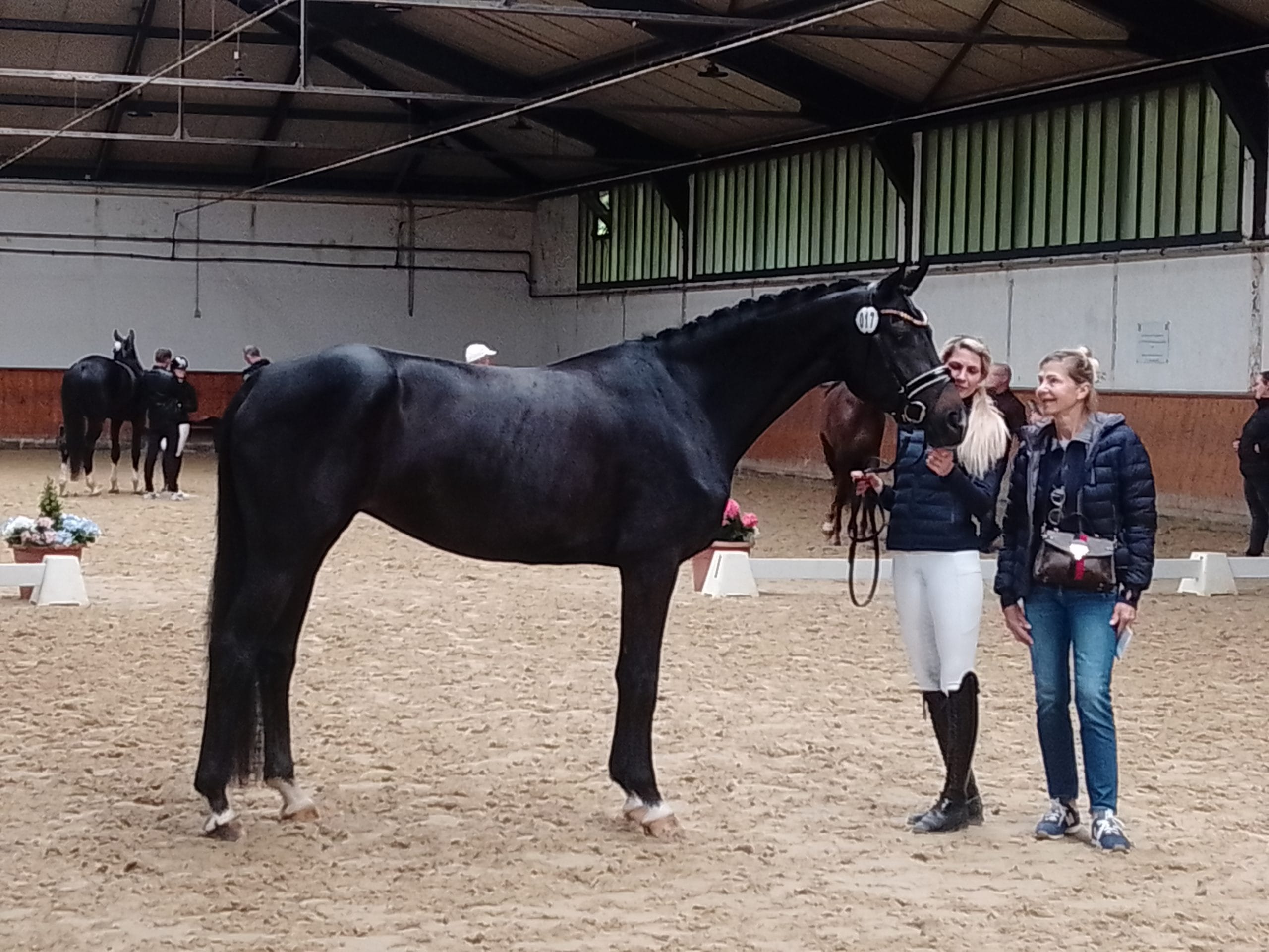 Der Vormittag sah eine Springstute an der Spitze, die allerdings auch hinsichtlich Typ und Bewegungsqualität einiges zu bieten hatte. Hann.Pr.St. Carlotte v. Comme Prévu/Valentino (Z. u. Bes.: Henning Bahr, Schwanewede) ist eine geschmackvolle Stute mit einem besonders imposanten Vorderpferd. Schönes Gesicht, halsbetont und bergauf konstruiert konnte sie von Beginn an gefallen. Entsprechend ihrer Konstruktion fiel die braune Stute auch in den Bewegungen durch eine ausgeprägte Vorderhandmechanik auf. Im Freispringen überzeugte sie mit guter Bascule und schnellem Vorderbein. Die Fünfjährige hatte bereits ein Fohlen von Asagao xx und ist damit bereits eine Hannoveraner Prämienstute.