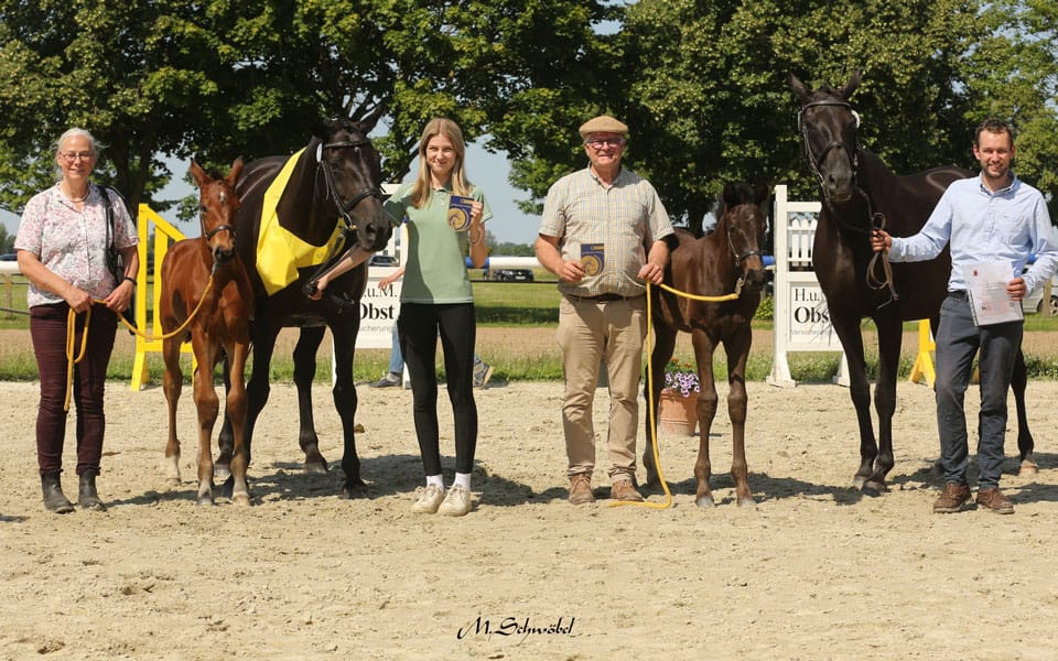 Das hatten sie nicht erwartet, aber an der Zuchtgemeinschaft Carsten Niemeyer/Andrea Berkenhoff vom Rittergut Brokeloh gab es in diesem Jahr kein Vorbeikommen. Typ, Eleganz und überdurchschnittliche, lockere Bewegung – damit punktete das Hengstfohlen v. Be My Dancer/Rotspon und setzte sich mit der Tageshöchstpunktzahl von 9,17 unangefochten an die Spitze. Keck und locker, mit schönem Typ so steppte das Stutfohlen v. Vidar/Fürst Nymphenburg daher und rangierte auf Platz zwei. Zusätzlich gab es für diese beiden wertvollen Fohlen ebenfalls die zusätzliche Fohlenauszeichnung des Hannoveraner Verbandes. Ein super erfolgreicher Tag für das Team vom Rittergut Brokeloh! Glambia v. Glamourdale/ Edward, ein rundum gelungenes, typvolles Rapphengstfohlen der Züchterin Liz Hope, Raddestorf, kam auf Platz drei. Den vierten Rang teilten sich ein Stutfohlen v. Don Nobless/De Angelo ( Z. u. B: Dieter Ihlo, Uchte) und ein Hengstfohlen v. Shu Fu Don Index ( Z. u. Bes.: Gerd Lühr, Borgholzhausen). In ihrem Resümee stellten die Richter fest, qualitätvolle Fohlen gesehen zu haben, die sich auf dem optimalen Platz gut in Szene setzen konnten.