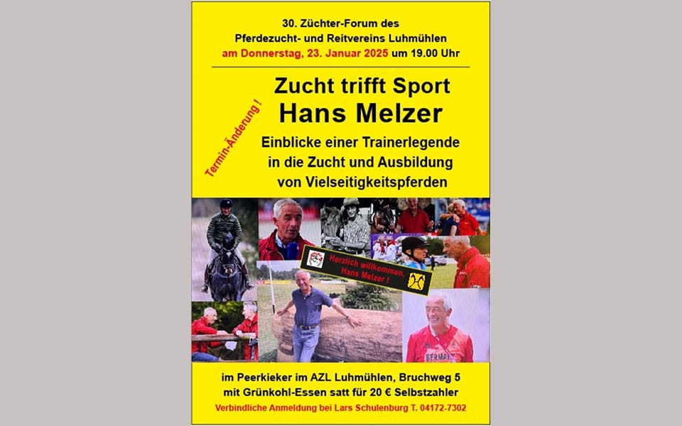Am Donnerstag, 23. Januar, lädt der Pferdezucht- und Reitverein zum 30. Züchter-Forum ein. Ab 19 Uhr gibt Trainerlegende Hans Melzer Einblicke in die Zucht und Ausbildung von Vielseitigkeitspferden, die Bedeutung des Vollbluteinflusses sowie das Management von Sportpferden.