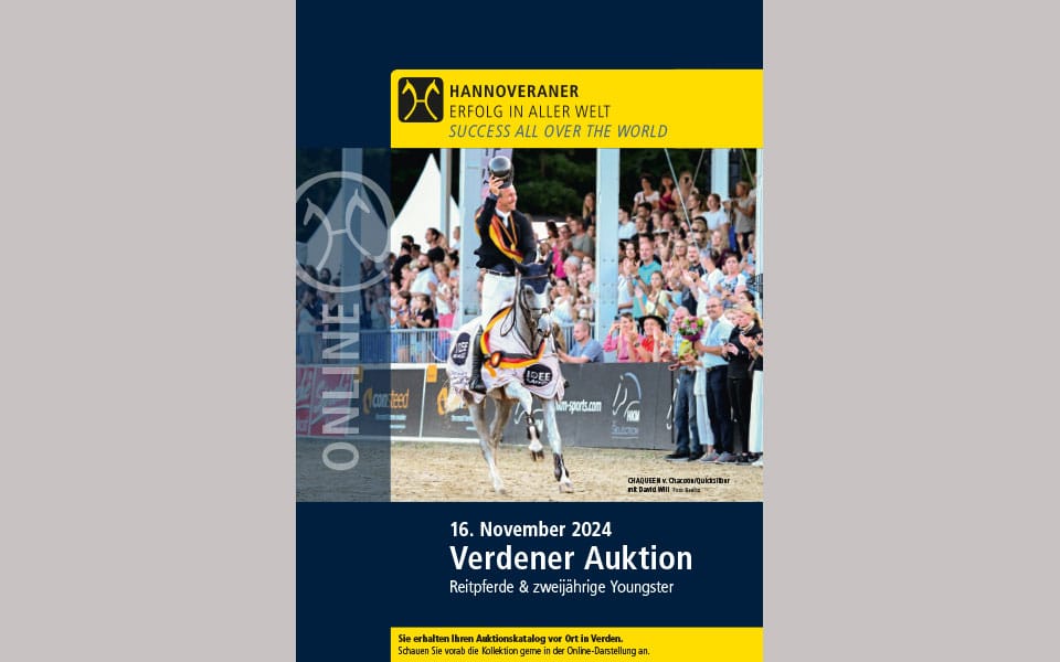 Wenn aus Auktionspferden spätere Champions werden, landen sie oft auf dem Titel einer Auktionsbroschüre. Bei der Titelheldin der Verdener Auktion am 16. November liegt die eigene Versteigerung noch nicht lange zurück. Vor genau zwei Jahren wurde sie in Verden einem Stammkunden aus dem Saarland erworben. Zwei Jahre später krönt sie sich als Siegerin der siebenjährigen Springpferde bei den Bundeschampionaten in Warendorf. Es handelt sich um die Schimmelstute Chaqueen v. Chacoon Blue/Quicksilber aus der Zuchtgemeinschaft Kruse, Walsrode.