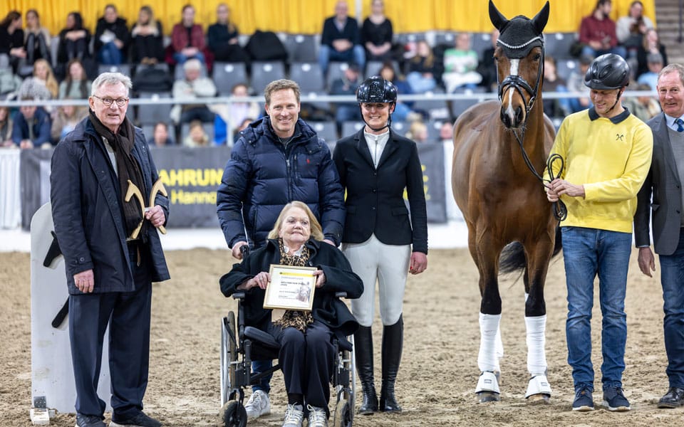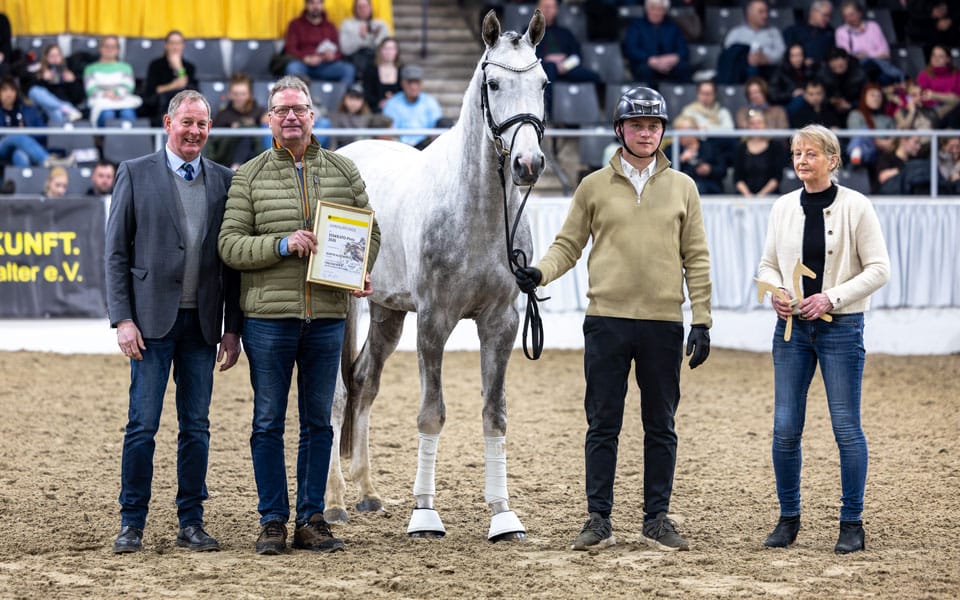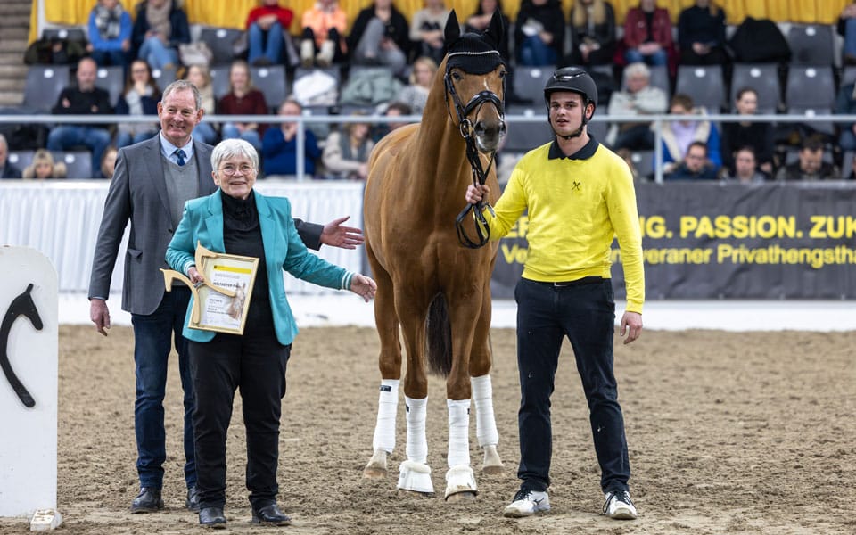 Die Zusammenarbeit des Landgestüts Celle und der Hengststation Hoffrogge ist von Erfolg gekrönt: Sie sicherten sich in Verden gemeinsam den Prämienhengst Venturo v. Valdiviani/Belissimo M (Z.: Ulla Katzorke, Essen), der sich jetzt Weltmeyer-Preisträger nennen darf. Dressursport ist fest in seinen Genen verankert, seine Mutter St.Pr.St. Leistungsstute Dressur Bohemian Rhapsodie ist selbst bis Inter I platziert, Großmutter Rhapsodie Queen bringt es auf zwei weitere Nachkommen, die auf höchstem Niveau im Viereck unterwegs sind. Venturo überzeugte in Teil I seines Sporttests Dressur in Münster-Handorf mit der herausragenden Endnote 9,19.